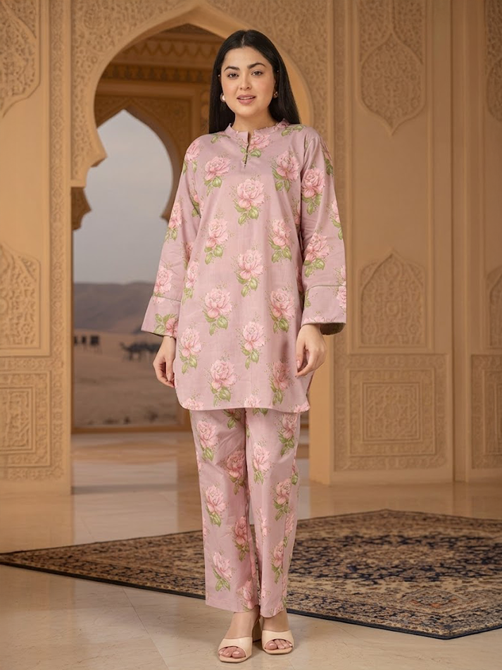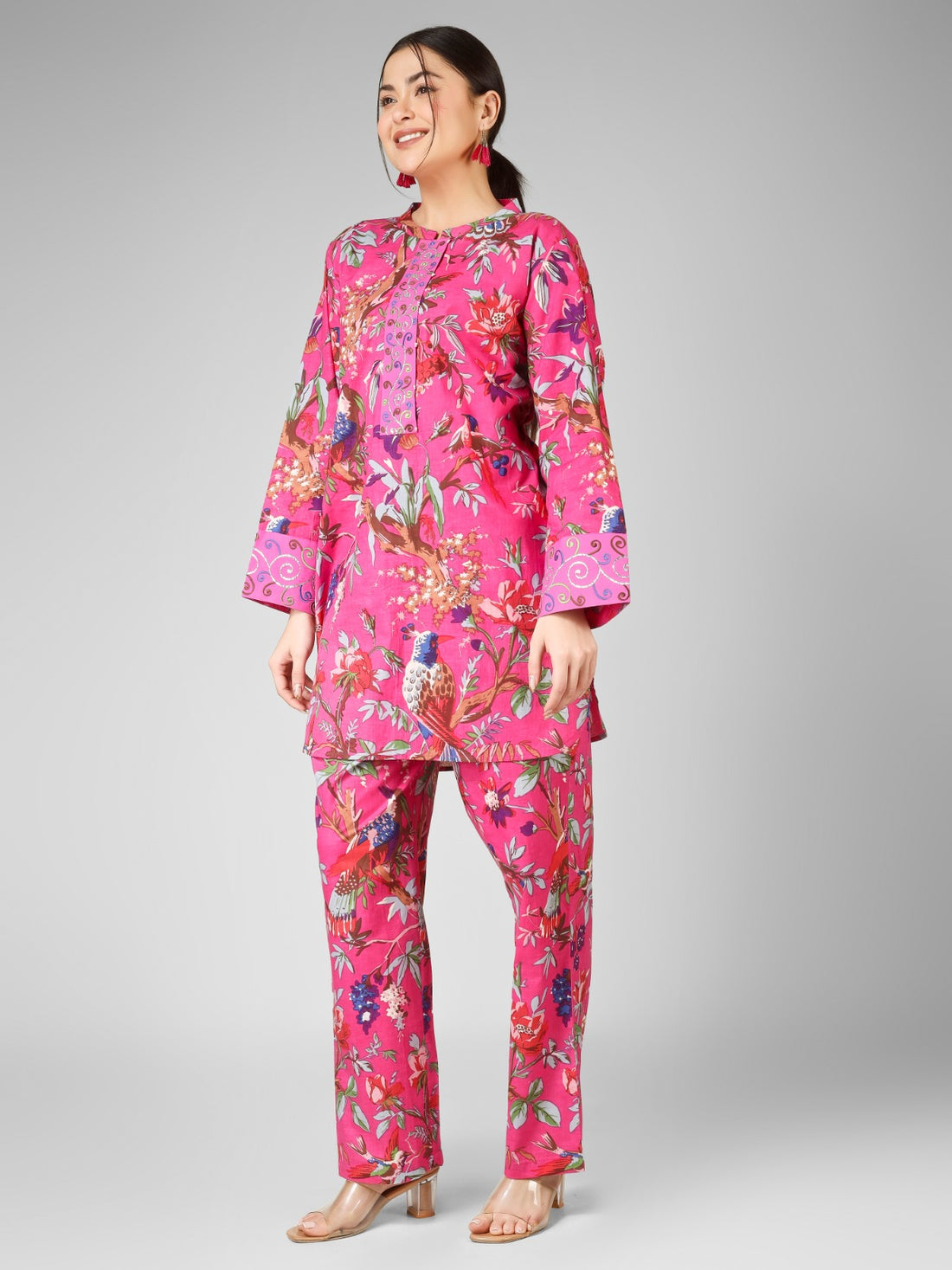 A charming pink rose printed pure organic cotton co-ord set designed for soft comfort and...