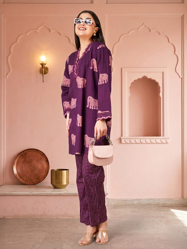 A rich plum-toned organic cotton co-ord set adorned with playful elephant motifs, elevated with delicate...