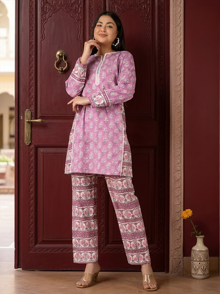 An elegant organic cotton co-ord set adorned with intricate hand block prints in a beautiful...
