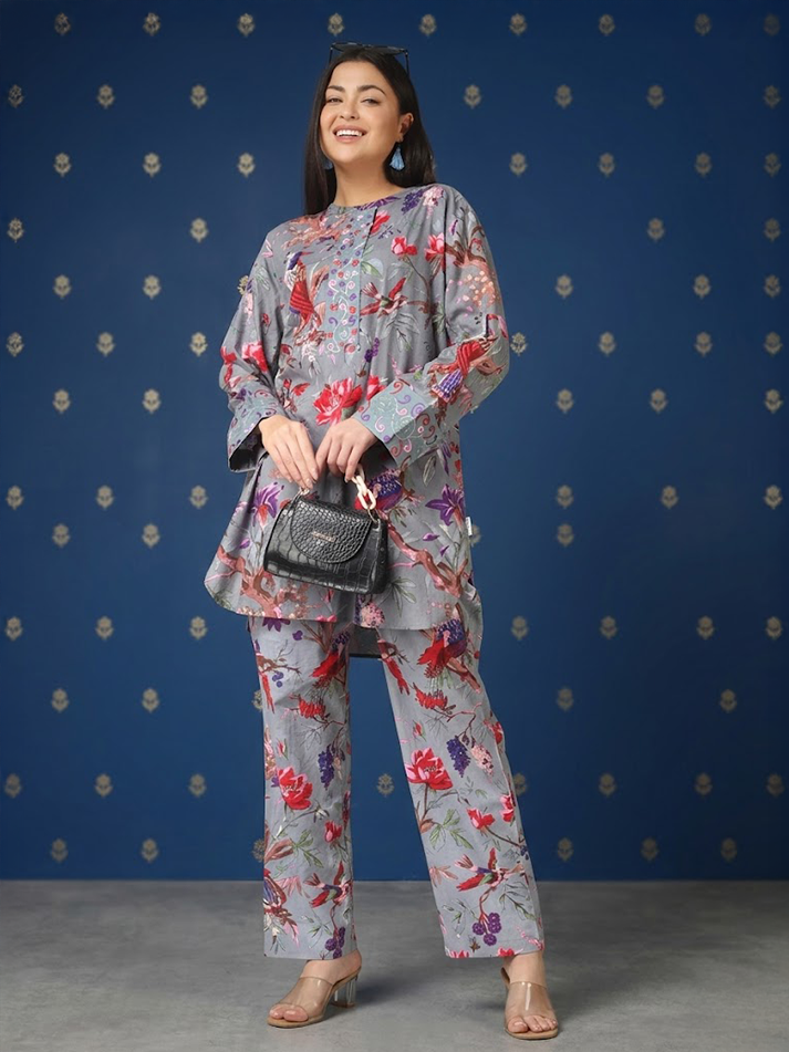 A vibrant organic cotton co-ord set adorned with lively floral prints, beautifully enhanced with traditional badla...