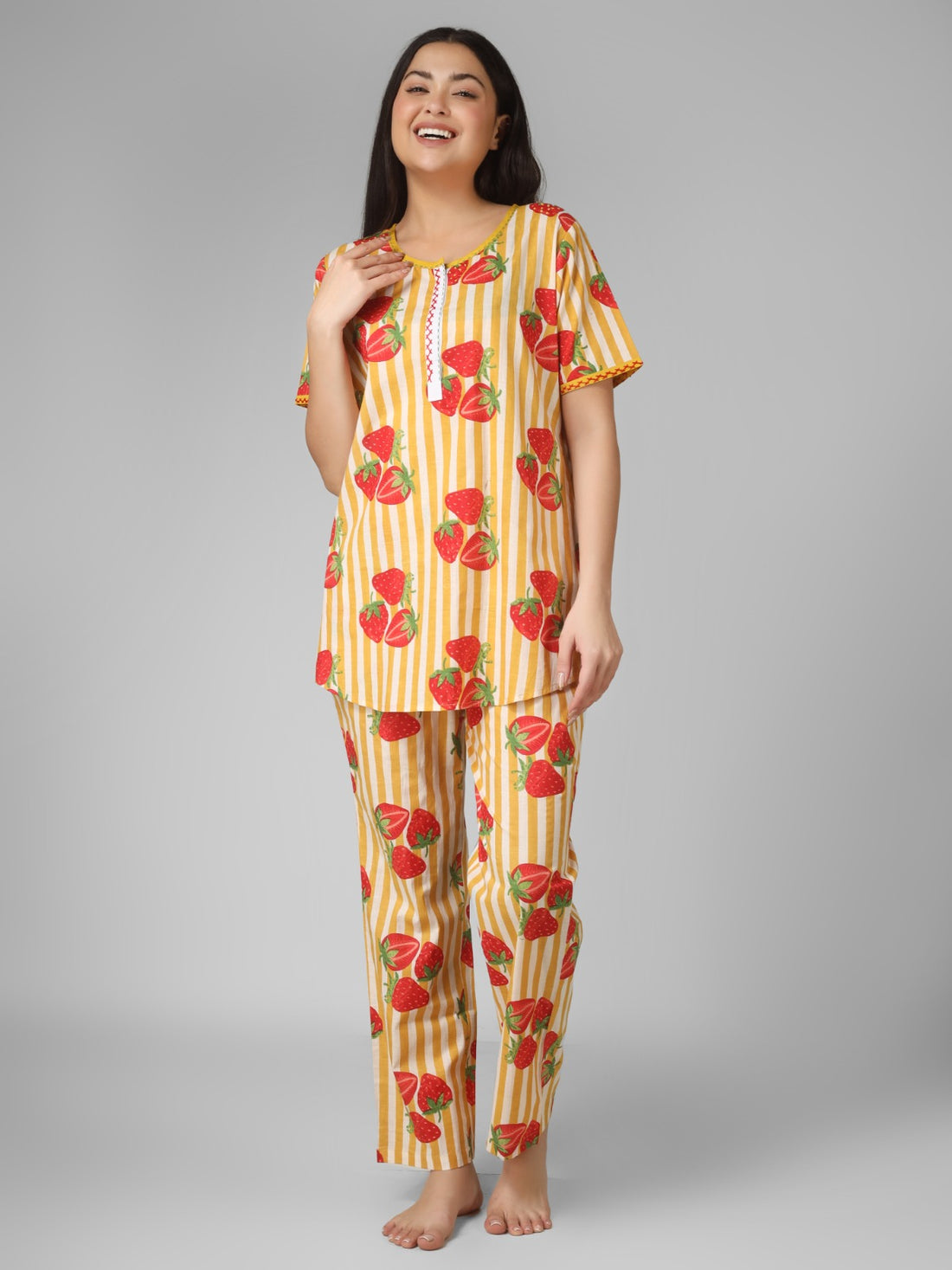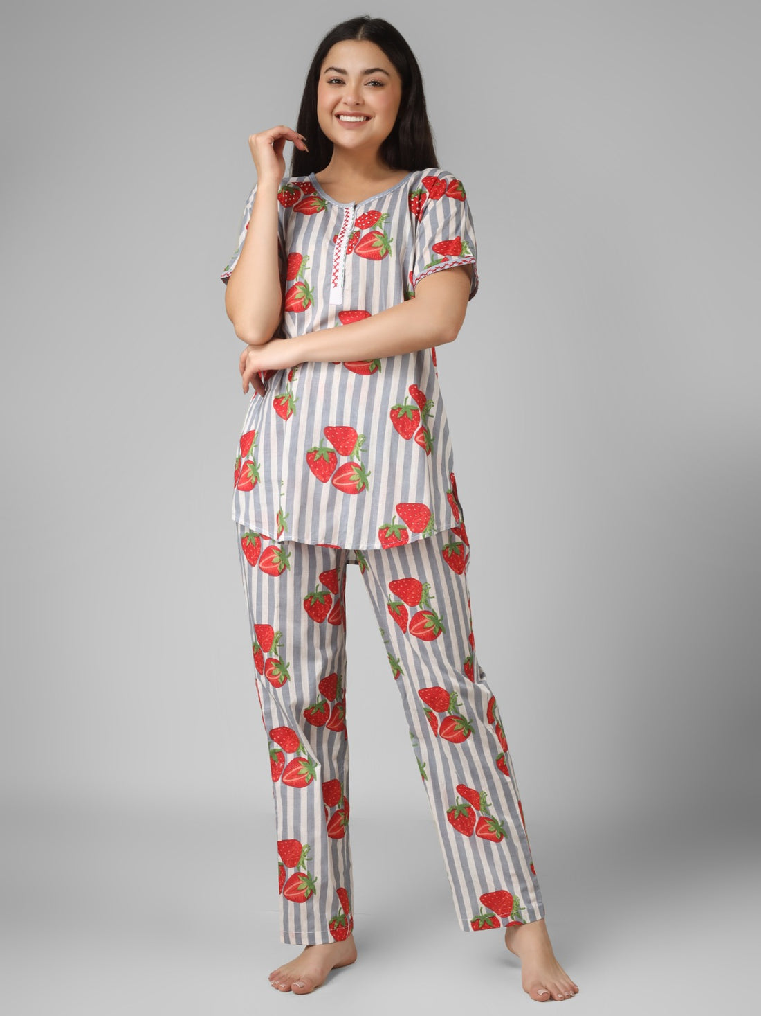 Add a touch of sweetness to your sleepwear collection with the Strawberry Bliss Cotton Nightsuit....