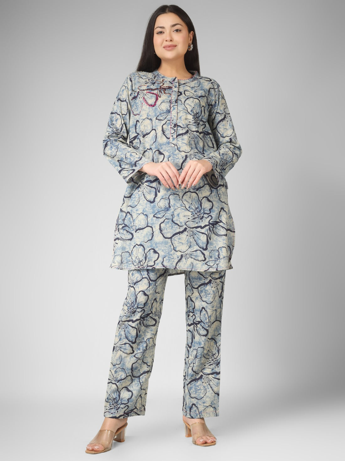 Graceful florals meet timeless elegance in this pure cotton co-ord set. Featuring delicate hand work...
