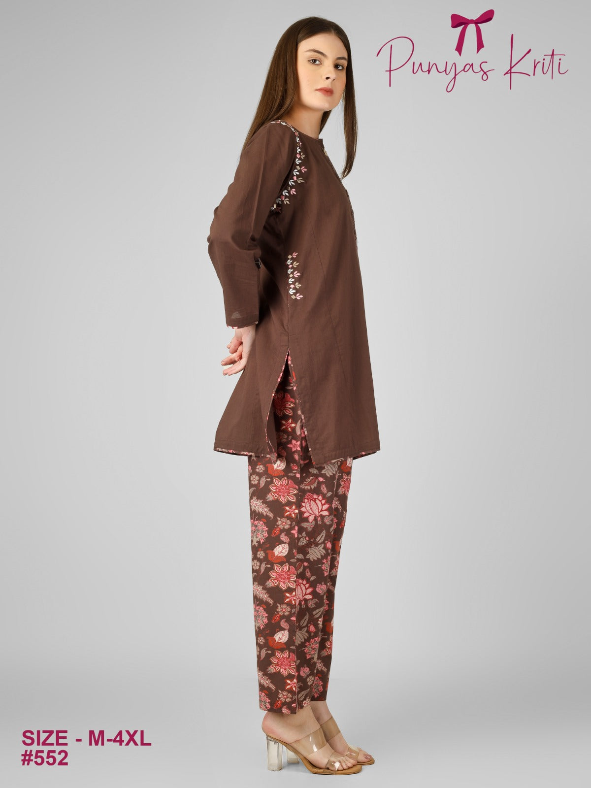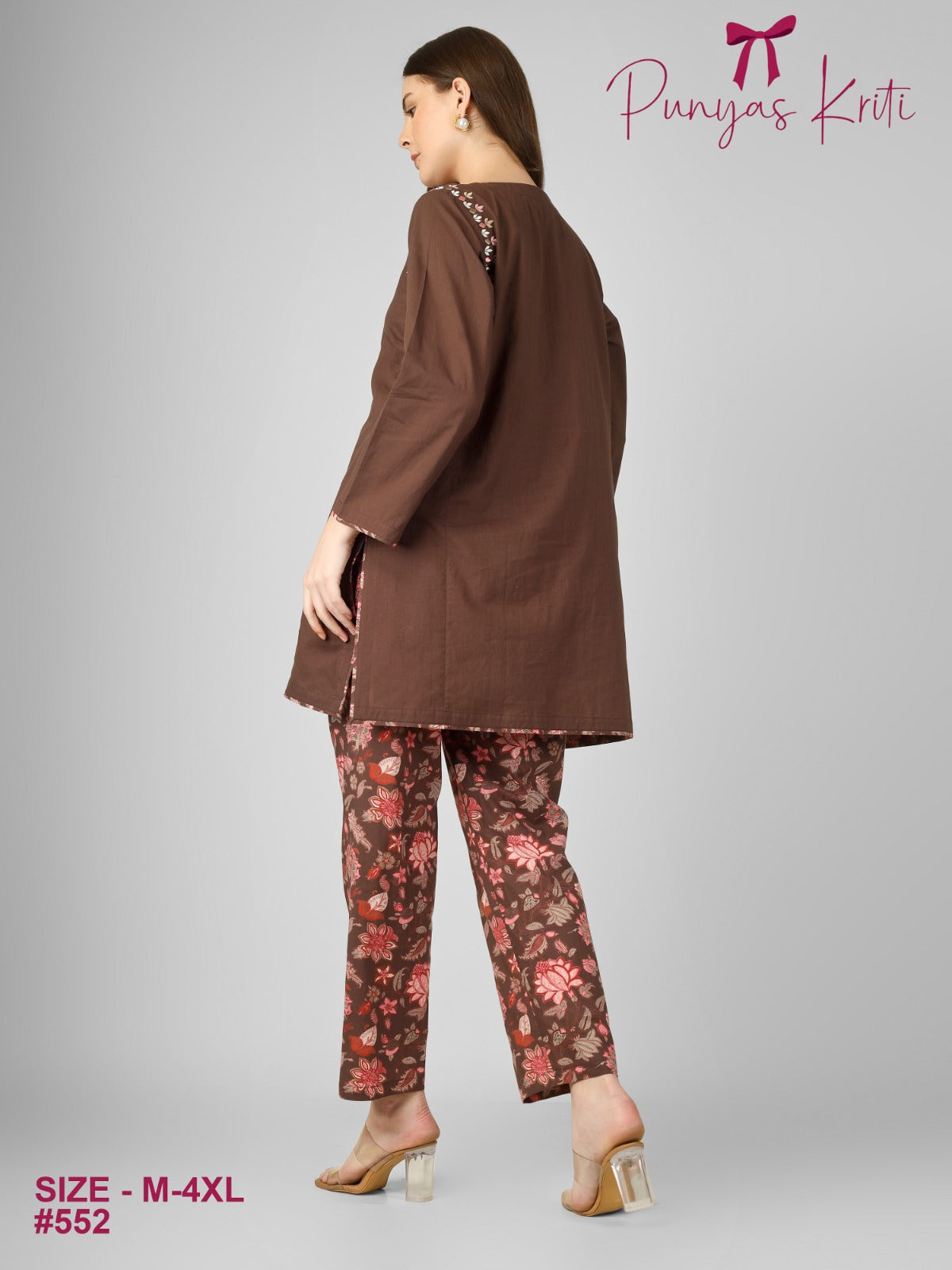 Designed for effortless elegance, this pure cotton co-ord set blends comfort with fine detailing. Subtle machine and hand embroidery, paired with elegant pocket work, adds a refined artisanal touch—perfect for everyday wear with a polished look.