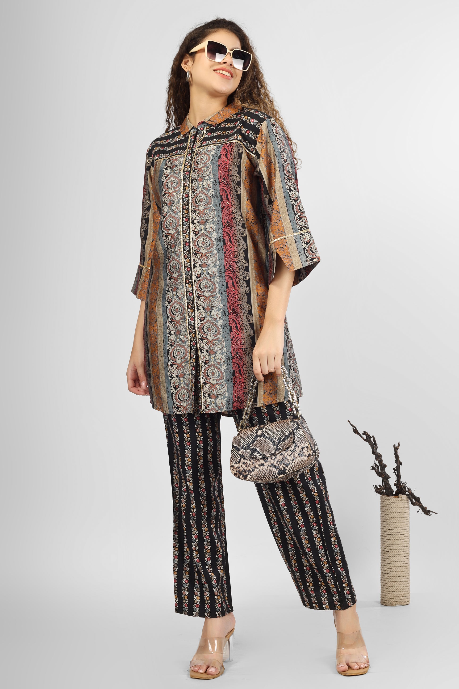 Make a bold statement with this ultra-vibrant black Chanderi coord set, crafted for those who love to shine! Adorned with lively multicolour prints with gold foiling and outlined with intricate golden Gota piping, this ensemble is the perfect blend of festive charm and everyday elegance. Whether you're celebrating a festival or stepping out in style, this chic set promises to elevate your look with effortless glamour and vibrant energy.