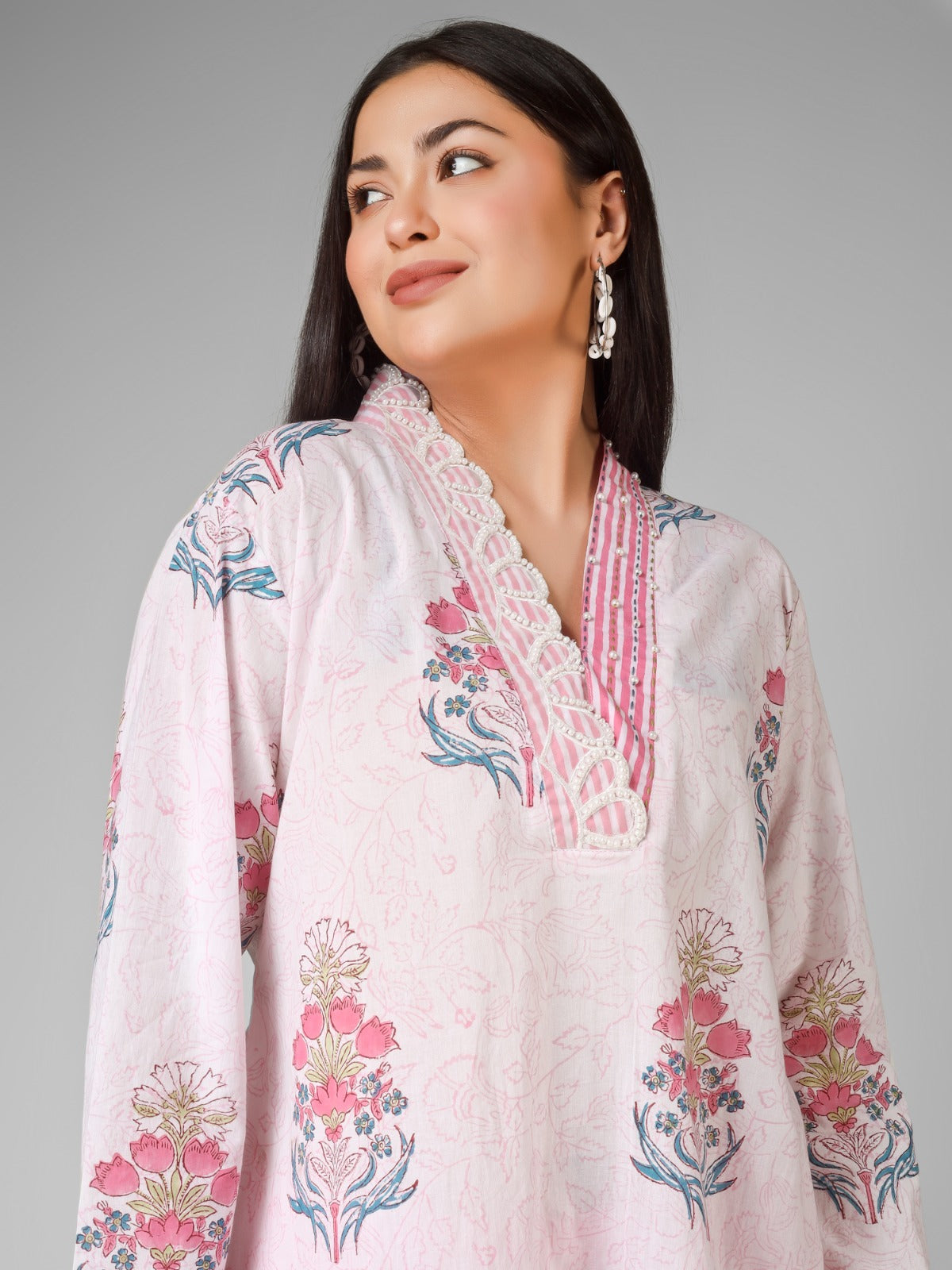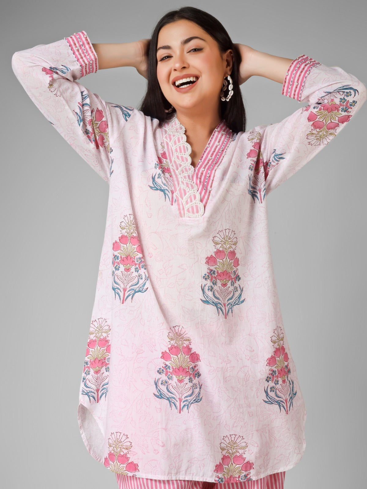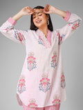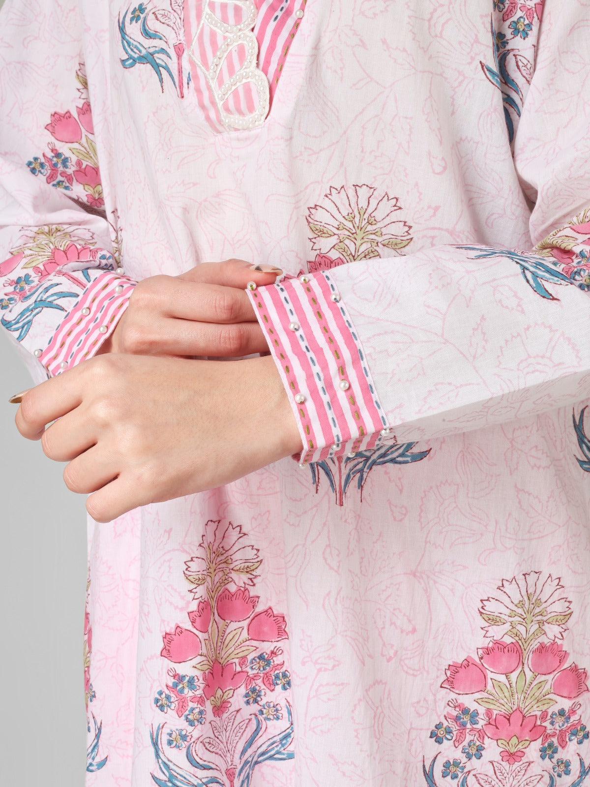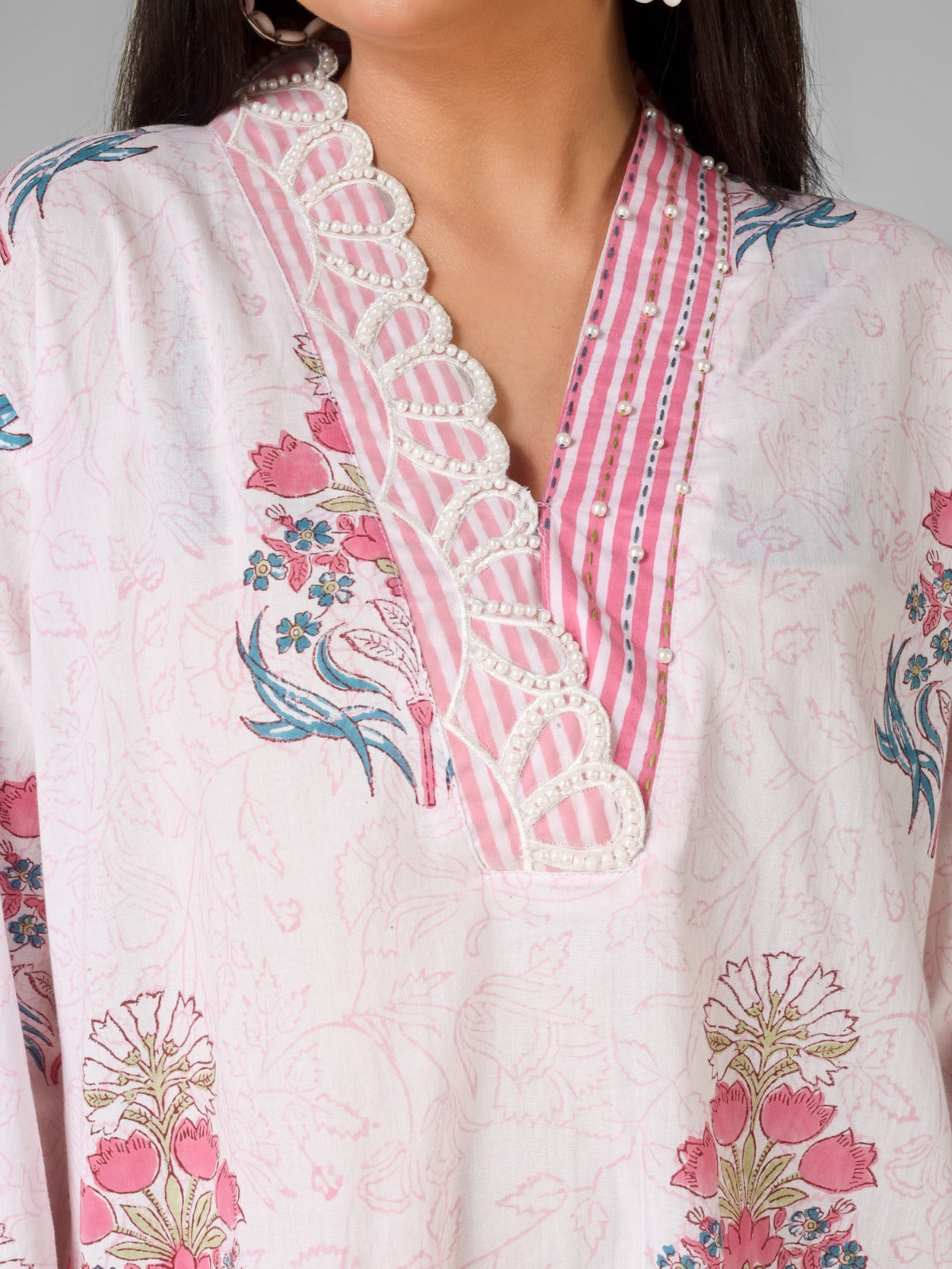 A soft blend of tradition and charm, this hand block print co-ord set is crafted in breathable organic cotton. Adorned with delicate floral motifs and highlighted with beautiful bead work on the neckline, it brings effortless grace to your everyday style.