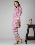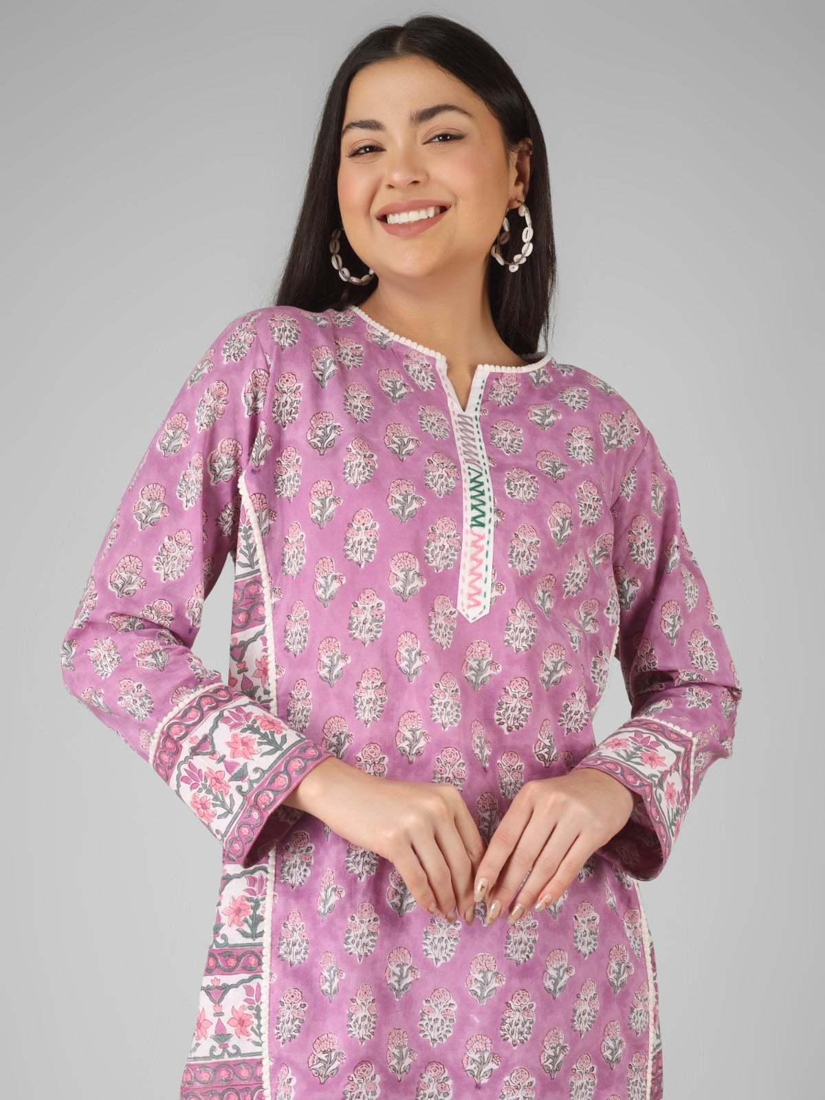 A graceful hand block printed co-ord set crafted from breathable organic cotton. The kurta features delicate hand embroidery and lace detailing on the neckline and front, paired with beautifully patterned straight pants. Perfect for effortless everyday elegance.