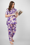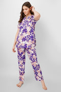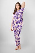 A chic blend of comfort and style, this nightsuit stands out with its pink base and bold purple-white florals. The delicate lace at the neckline lends subtle elegance, while the relaxed fit and short sleeves keep it effortlessly easy. Perfect for cozy nights and slow mornings.