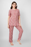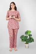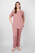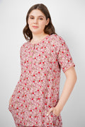 Our Blush Petals Nightsuit combines delicate charm with effortless comfort. A soft pink base dotted with red and white florals is elevated by intricate handwork at the neckline and playful green buttons. Paired with full-length bottoms, it’s perfect for stylish lounging or drifting into peaceful, cozy sleep.