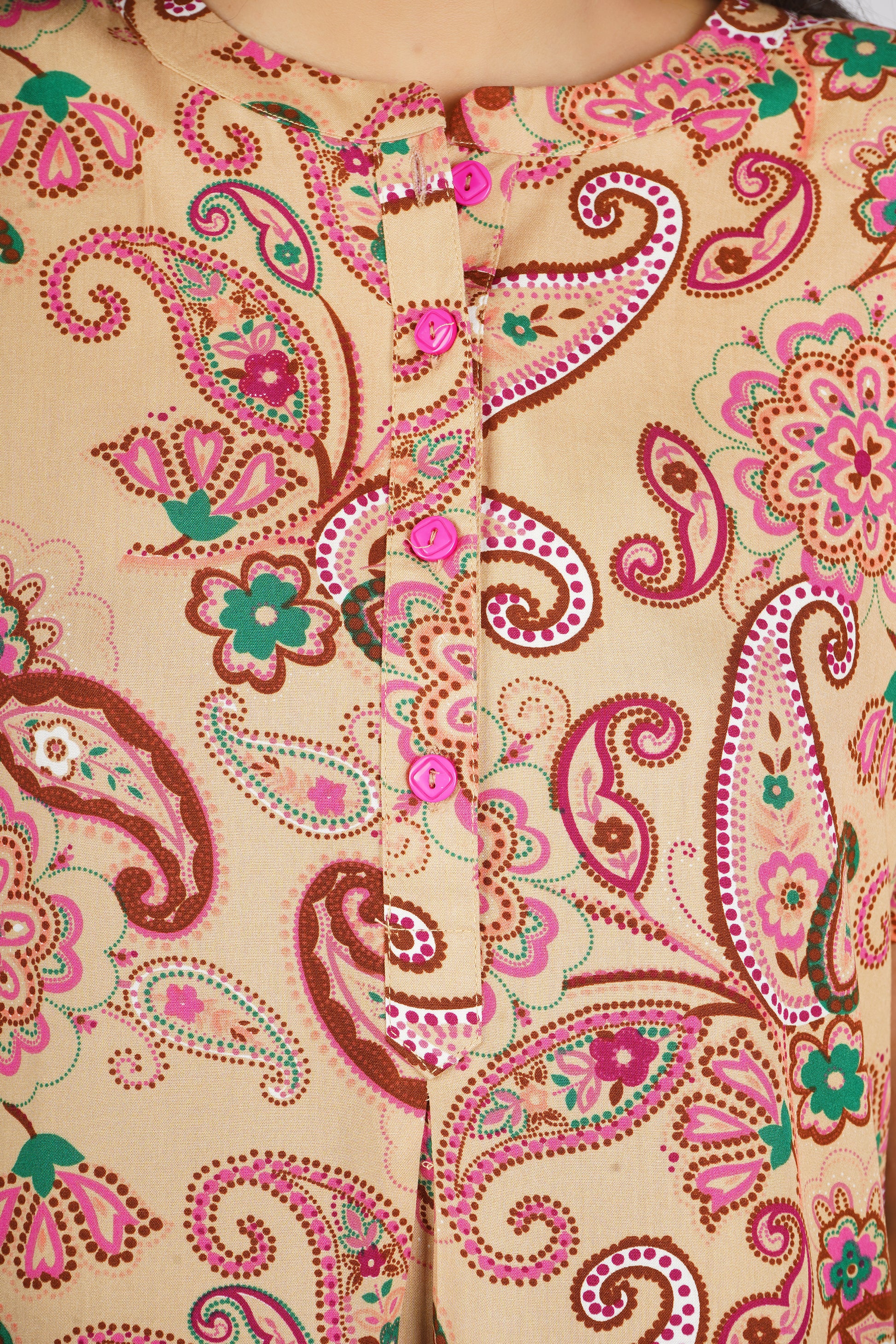 Our Fawn Paisley Nightsuit Set wraps you in timeless elegance and comfort. A warm beige base comes alive with vibrant pink and green paisley motifs, creating a refined, stylish look. Its relaxed silhouette and thoughtful design make it perfect for restful nights or cozy lounging, adding sophistication to your nightwear collection.