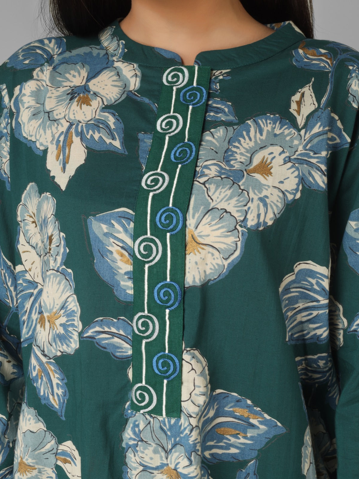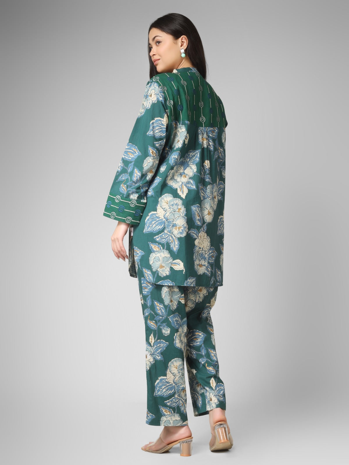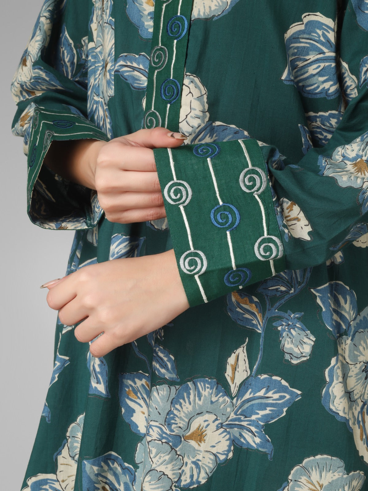 A perfect blend of tradition and modern elegance, this forest green floral printed organic cotton co-ord set features refined machine embroidery on the placket, cuffs, and back. Designed for daily wear, it offers breathable comfort while showcasing delicate artisanal detailing, making it a versatile and stylish ethnic outfit.