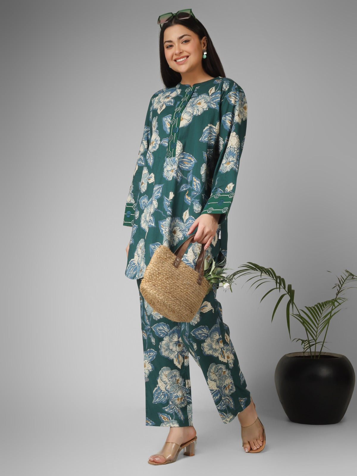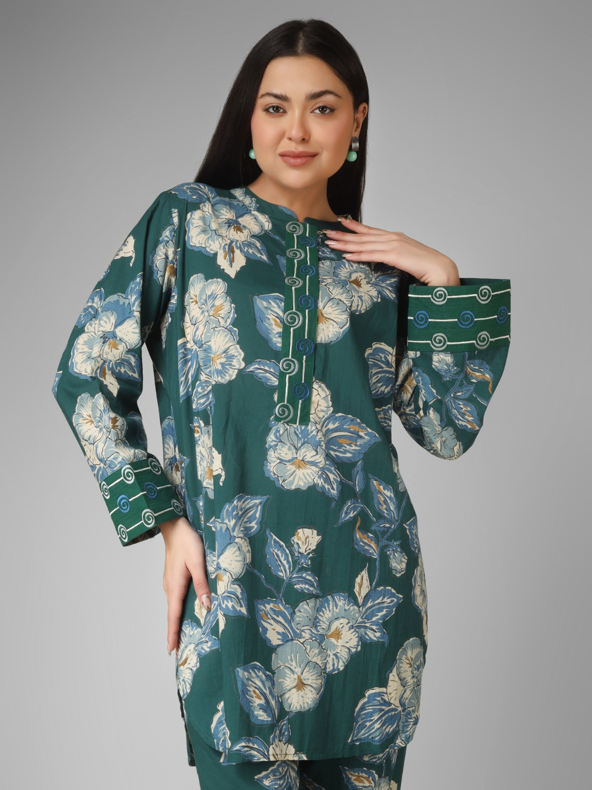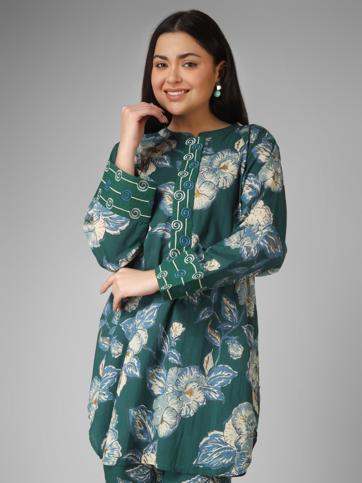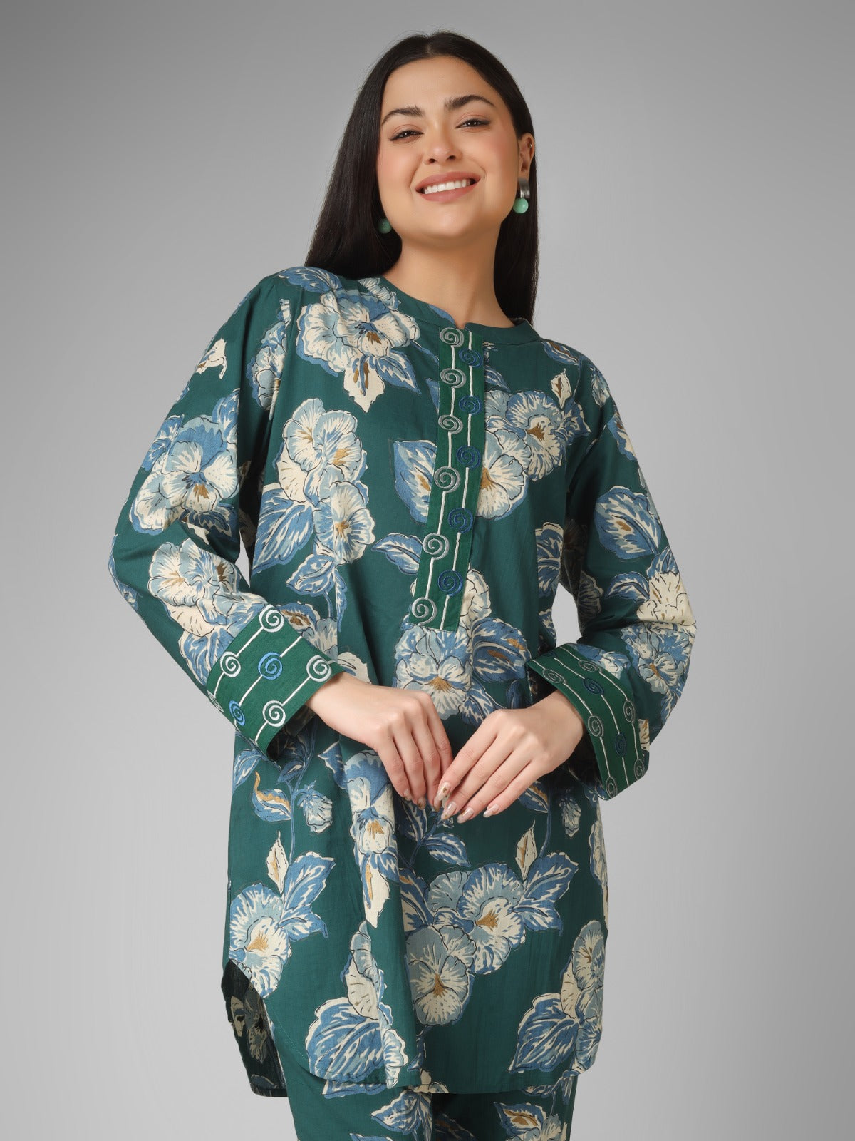A perfect blend of tradition and modern elegance, this forest green floral printed organic cotton co-ord set features refined machine embroidery on the placket, cuffs, and back. Designed for daily wear, it offers breathable comfort while showcasing delicate artisanal detailing, making it a versatile and stylish ethnic outfit.