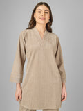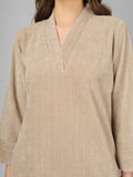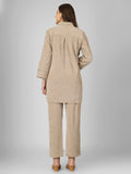 Embrace the softness of subtle tones with our Honey Dew Woollen Co-ord Set. Crafted from a rich wool-blend fabric, this set wraps you in warmth while exuding refined charm. The soothing fawn hue pairs beautifully with delicate hand embroidery on the neckline and sleeves, adding an artisanal touch to its minimalist silhouette.