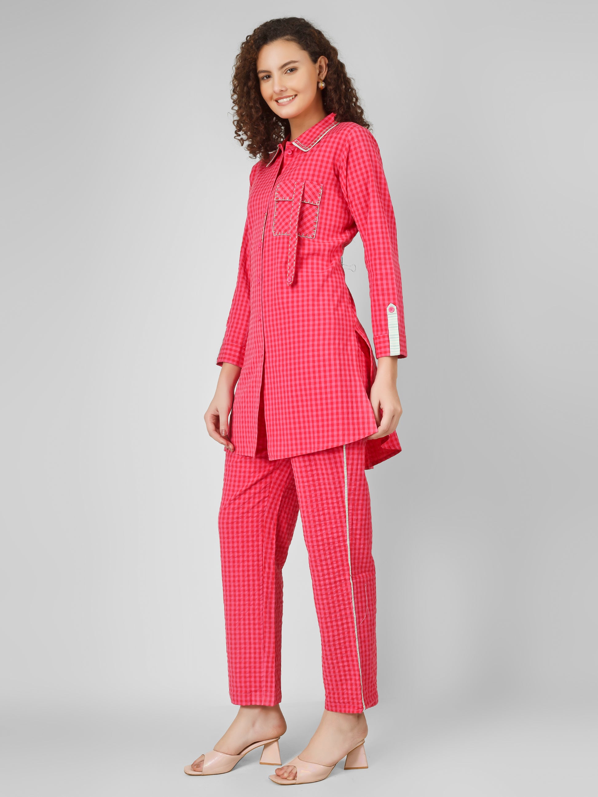 Brighten your sunny days with the Magnetic Magenta Co-ord Set, a playful and stylish addition to your casual wardrobe. Its cheerful gingham pattern, relaxed silhouette, and charming artisanal touches make it perfect for casual outings or relaxed weekends. Designed for comfort with a fun, vibrant flair, this set keeps your everyday style fresh and effortless.- fun look ready to turn heads wherever you go