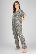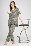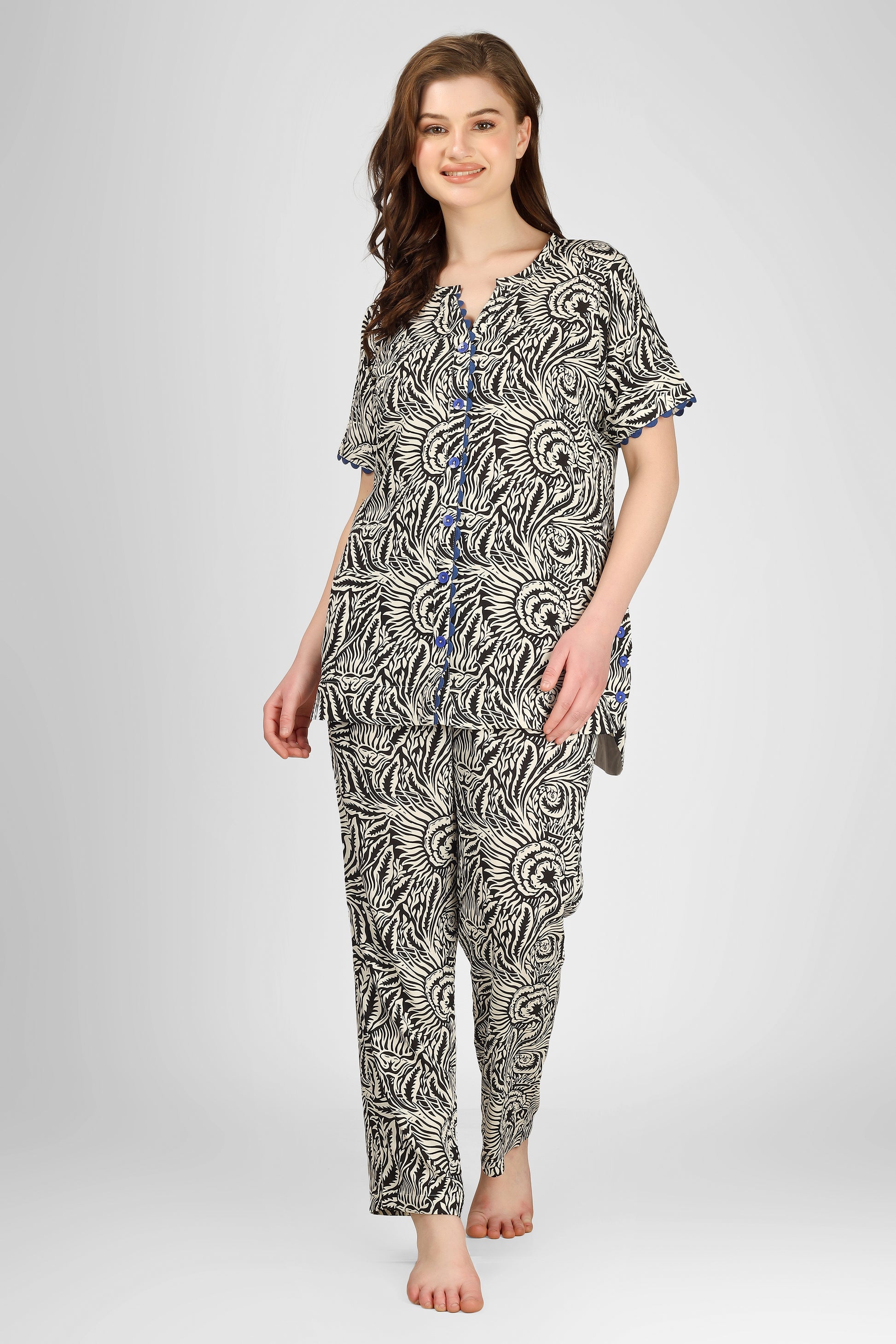 Our Midnight Charm Lounge Set redefines nightwear with effortless style and comfort. A sleek black print is paired with navy lace accents, subtle gray piping, and a unique triple-button detail for a chic, modern look. The high-low silhouette makes it perfect for lounging, casual hosting, or stepping out in style.