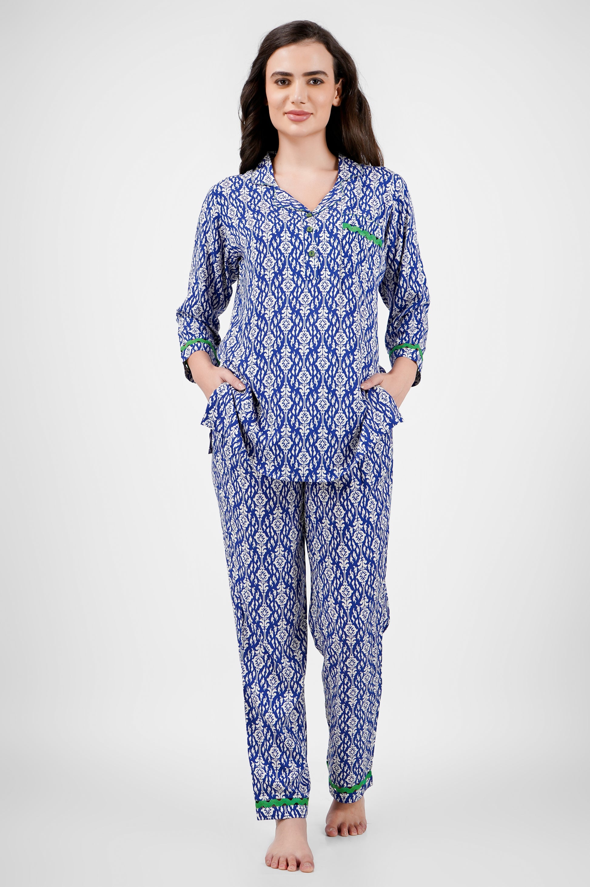 Relax in effortless style with the Ocean Breeze Nightsuit. Its charming design and vibrant pattern make it perfect for peaceful nights and leisurely mornings, adding a splash of versatile elegance to your loungewear collection with soft, breathable fabric and delicate green lace accents.