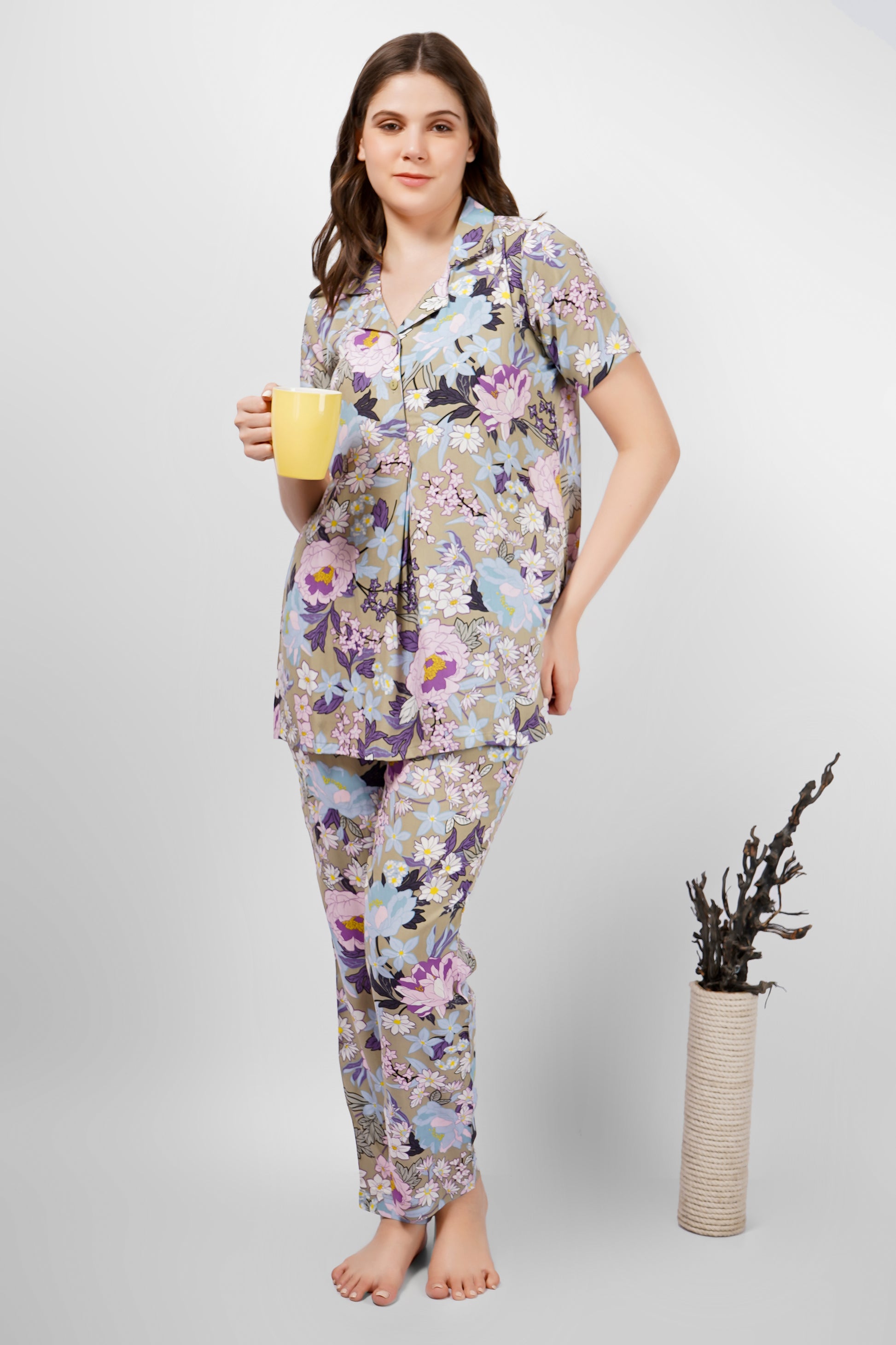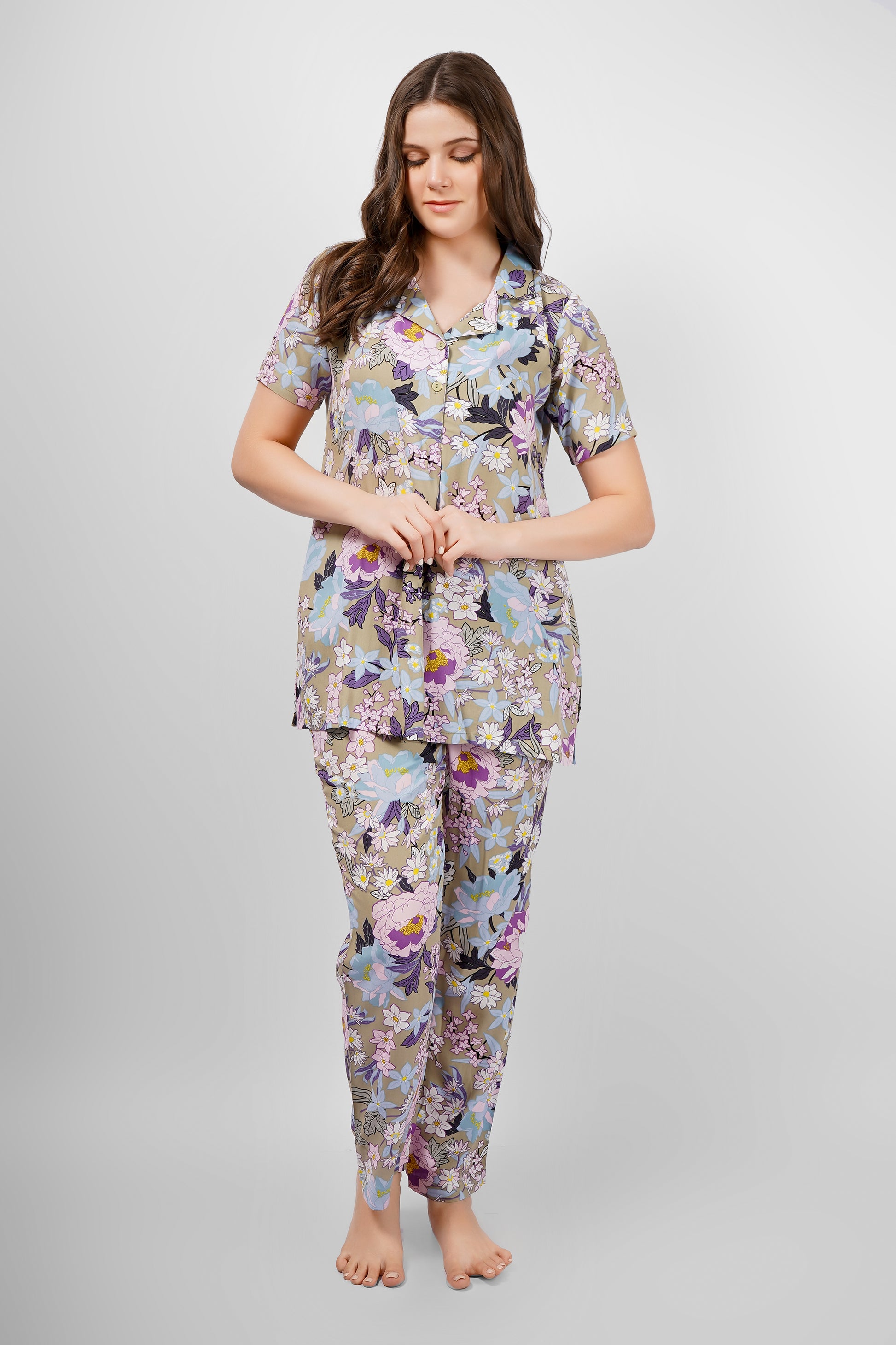 Unwind in effortless style with our Olive Flore nightsuit set, crafted for the perfect balance of luxury and comfort. The collared top with delicate button details pairs beautifully with full-length floral bottoms, creating an elegant yet easy look. Soft, breathable, and timeless—your new bedtime favorite.