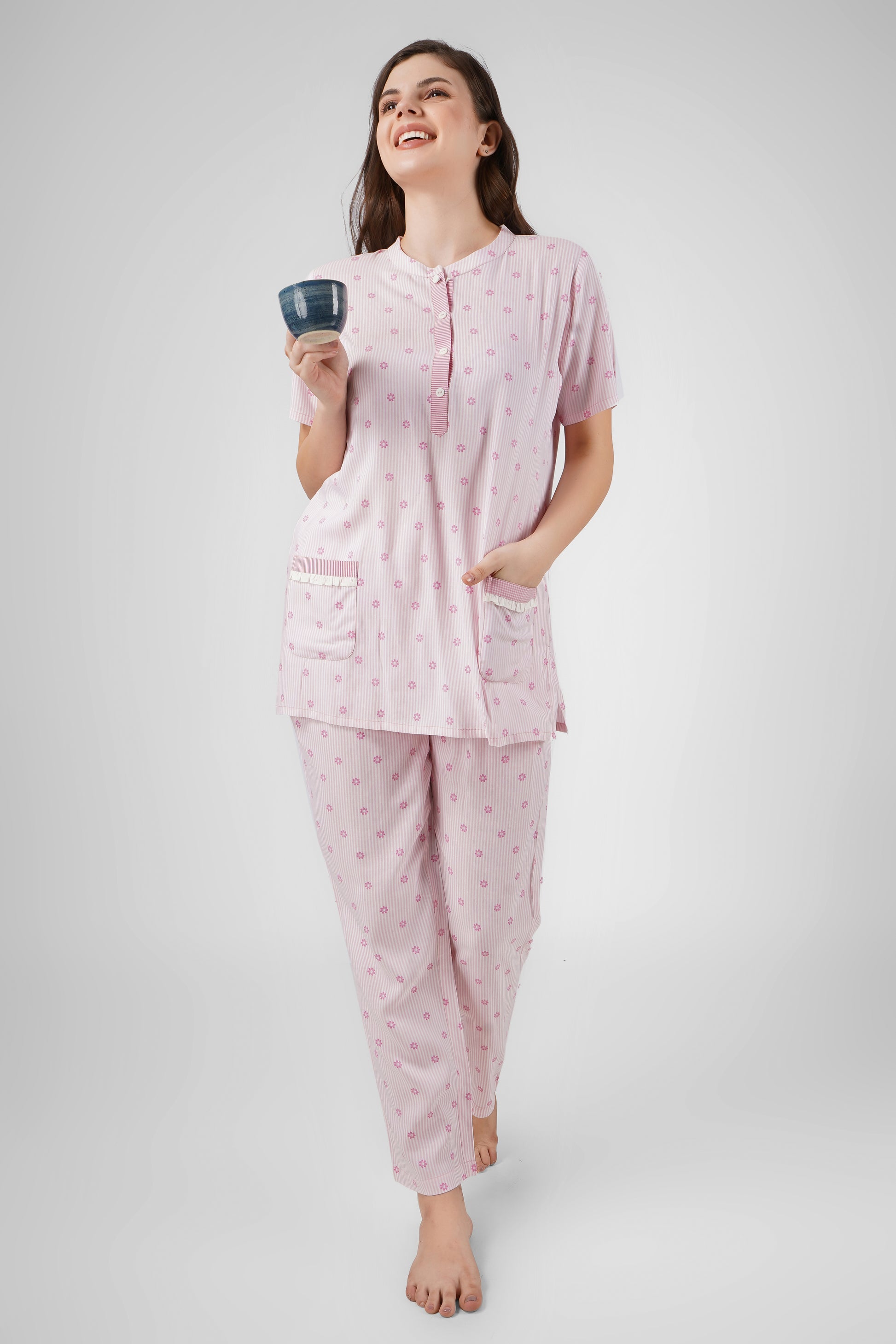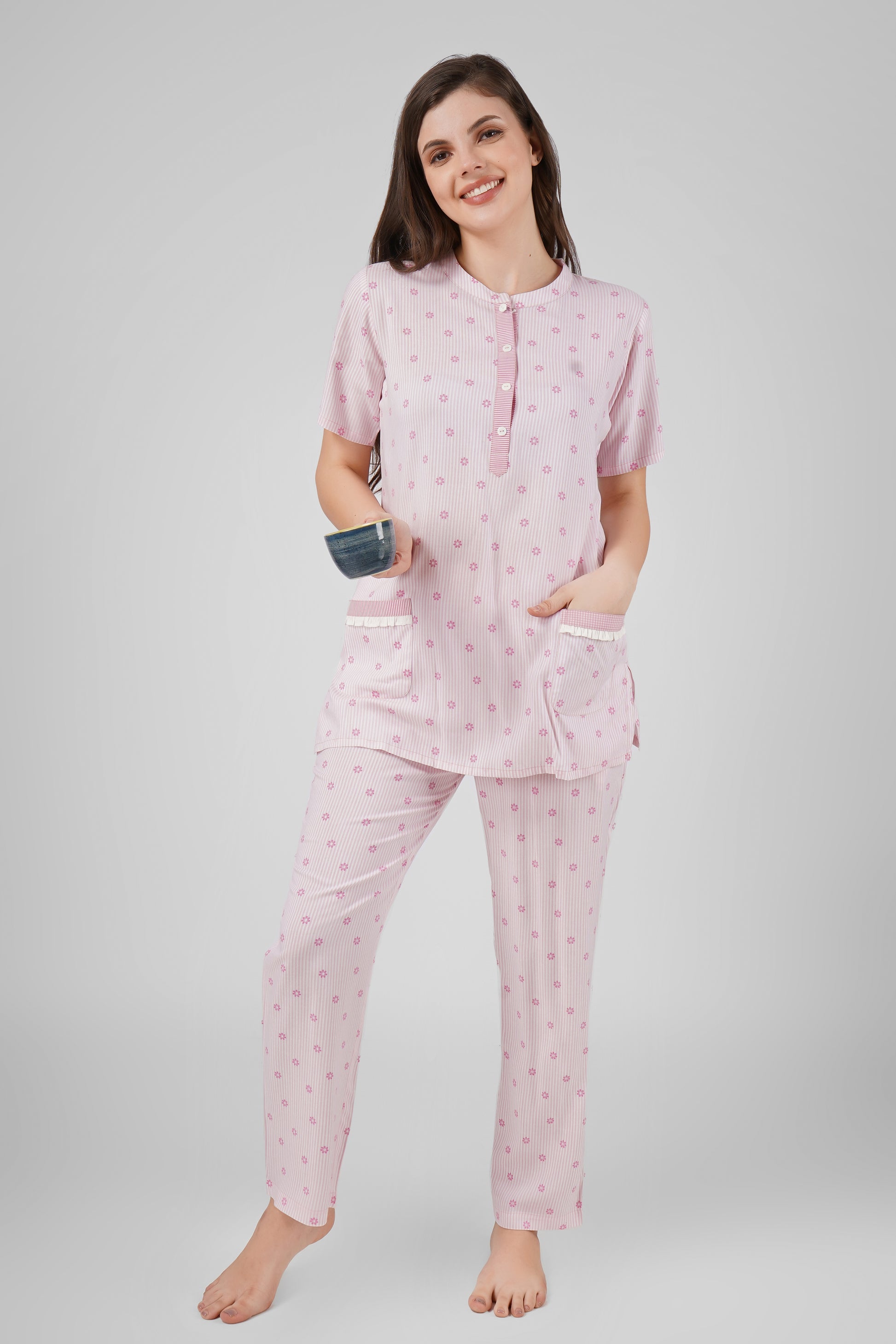 Our Pink Petal Nightsuit Set wraps you in soft, feminine charm. Dainty florals and delicate lace accents create a graceful, cozy look, while thoughtful design details add subtle elegance. Perfect for relaxing evenings or leisurely mornings, it blends cuteness with effortless comfort.
