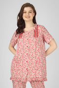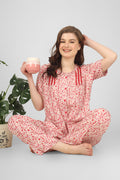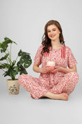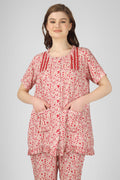 Red Whisper Nightsuit Set adds a playful pop of charm to your nightwear. Crafted in breathable fabric with delicate gathers and frill accents, it blends comfort with a feminine touch. The red florals on a cream base bring a lively yet elegant vibe—ideal for lounging or unwinding into restful sleep.