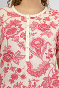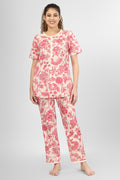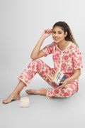 Experience effortless style and comfort with this Pure Cotton Nightsuit Set. Soft, breathable fabric keeps you cozy for restful sleep or relaxed lounging, while delicate gray handwork at the neckline adds artisanal charm. Contrasting stitches and a bold floral print on a soft base bring a lively yet graceful touch to your nightwear.