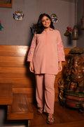 Dreamy, plush, and effortlessly refined — the Rosé Reverie Woollen Co-ord is where winter comfort meets quiet luxury. Crafted in a woollen fleece–velvet blend, it drapes with a soft sheen and envelops you in warmth. Hand-embellished with intricate embroidery and glistening glass beads on the collar, neck, and back, this set is pure understated glamour. The statement sleeves add that touch of festive artistry — perfect for cozy brunches or evening get-togethers when you want to feel dressed-up yet at ease.