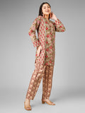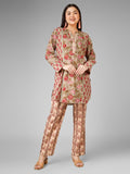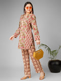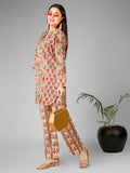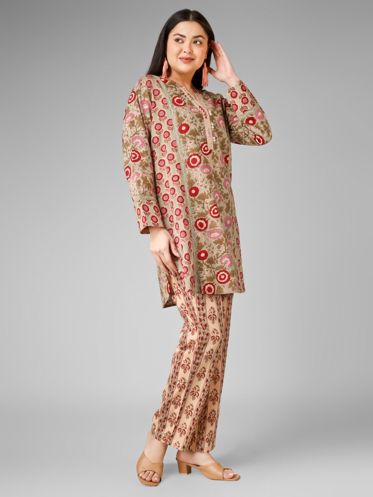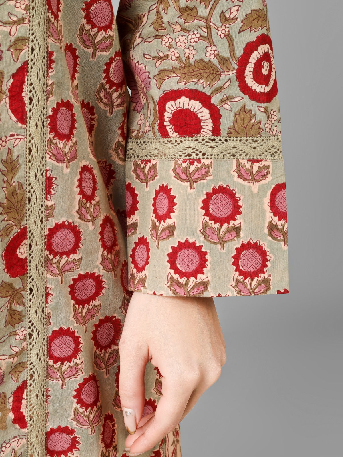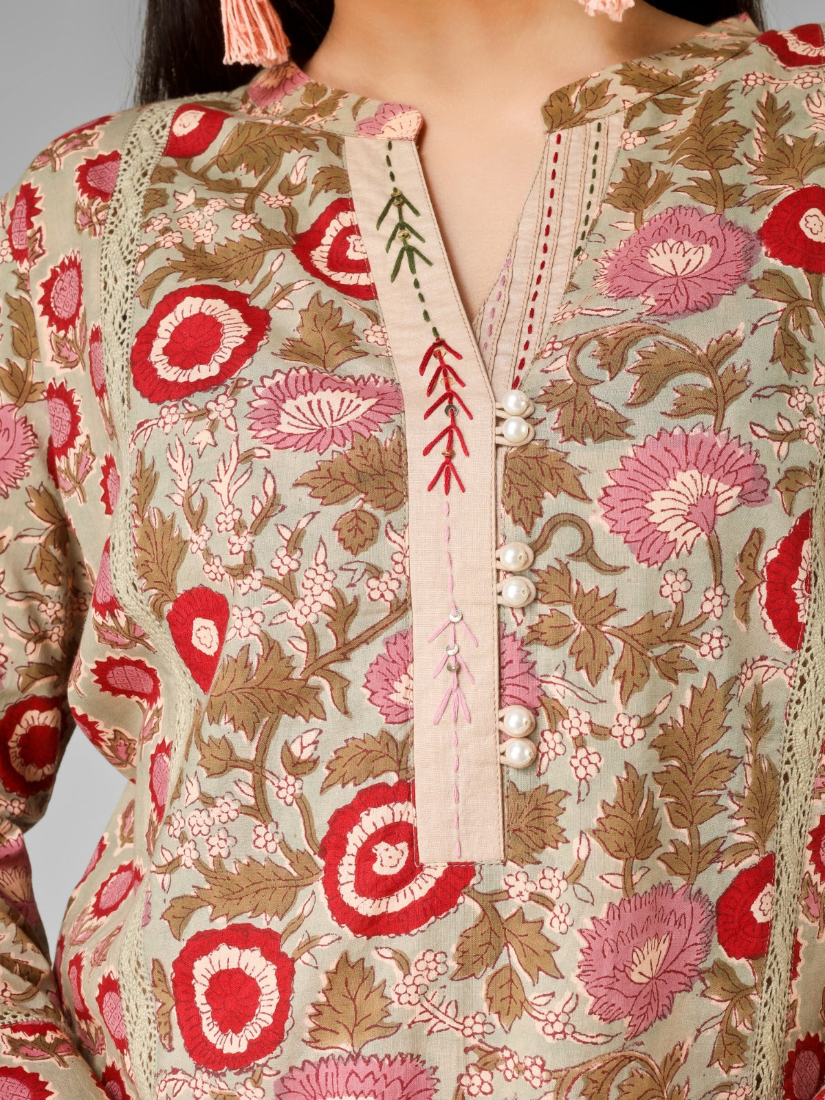 A beautifully crafted organic cotton co-ord set featuring hand block prints in a three-print same color combination. Enhanced with delicate lace detailing and fine handwork on the placket, this piece offers timeless elegance with everyday comfort.
