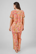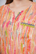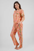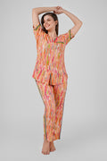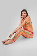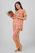 Our Tangerine Bliss Nightsuit Set brings cheerful elegance to your evenings. Vibrant abstract brushstrokes in orange and pink are complemented by delicate dual-color lace, creating a lively yet graceful look. Perfect for stylish lounging, restful nights, or gifting with a touch of personality, it blends comfort and charm effortlessly.