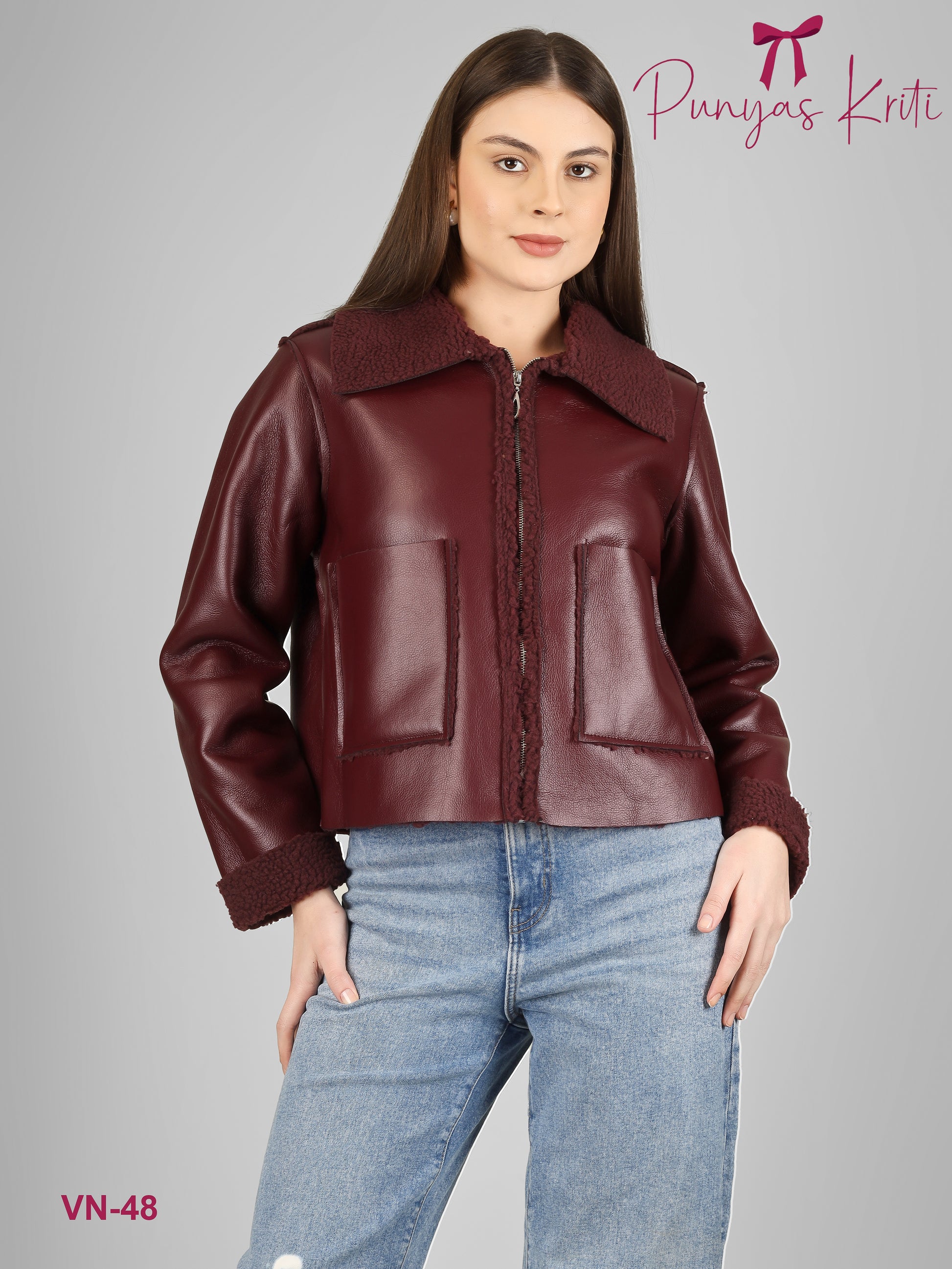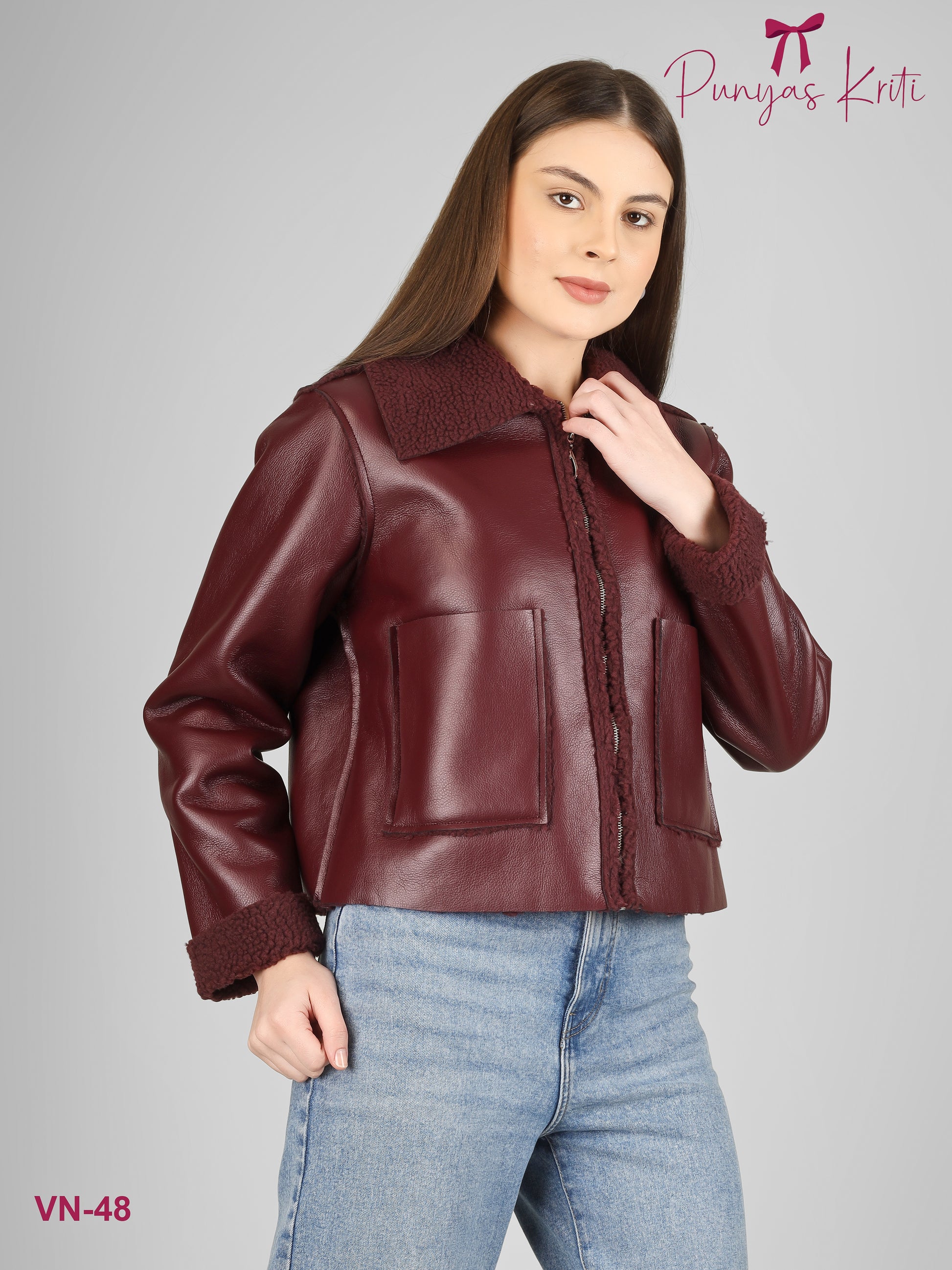 A stunning imported Turkish short jacket in a rich maroon shade, featuring a sleek leather-look texture and warm fleece lining—perfect for chic winter styling.